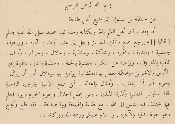 وهذا تؤكده كذالك الرسالة التي أرسلها حنظلة بن صفوان الكلبي، لأهل طنجة يحتهم فيها على العودة للطاعة، وقد أوردها صاحب كتاب «رياض النفوس» العالم الفقيه أبو بكر عبد الله بن محمد المالكي {1061م}، في الصفحة 67 على الشكل التالي :