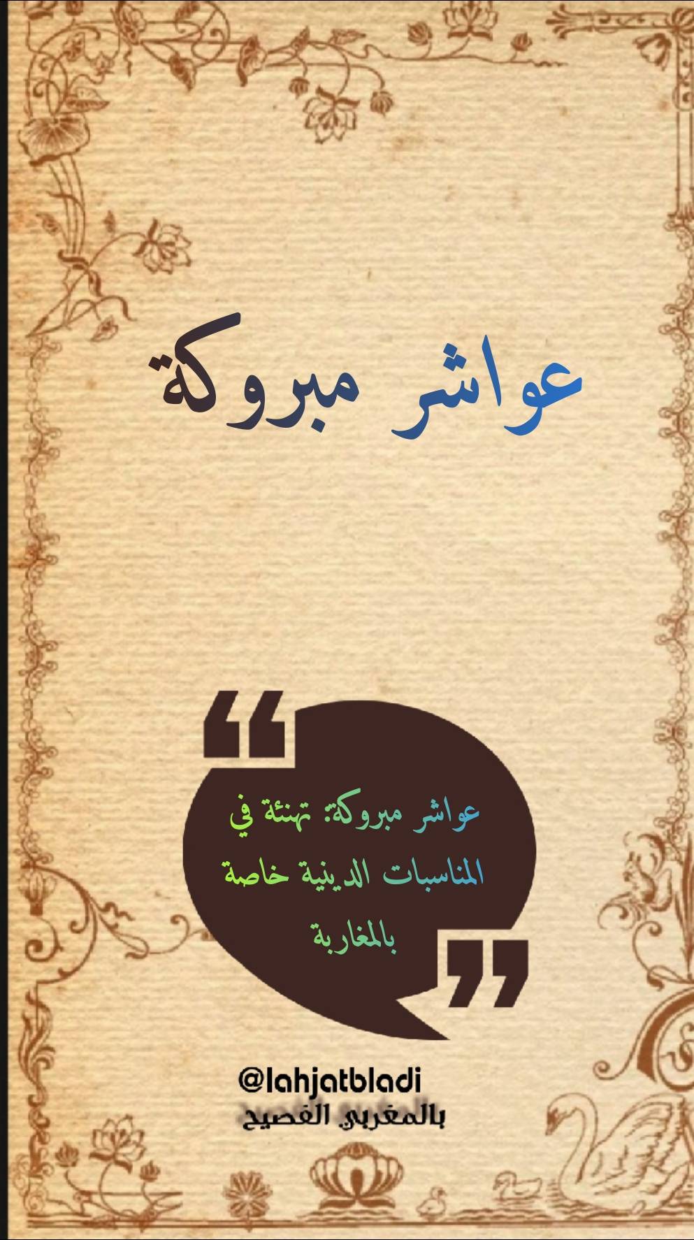 يقول المغاربة : مبروك_العواشر أو عواشر مبروكةو لا فرق بين التقديم والتأخير، فالمعنى واحد. [وبغض النظر عن مدى سلامة العبارة من الناحية اللغوية لدلالتها الأصلية في اللجهة العامية، إلاأن المقصود. مبارك ،لأن مبروك تعني مكان بروك البعير.