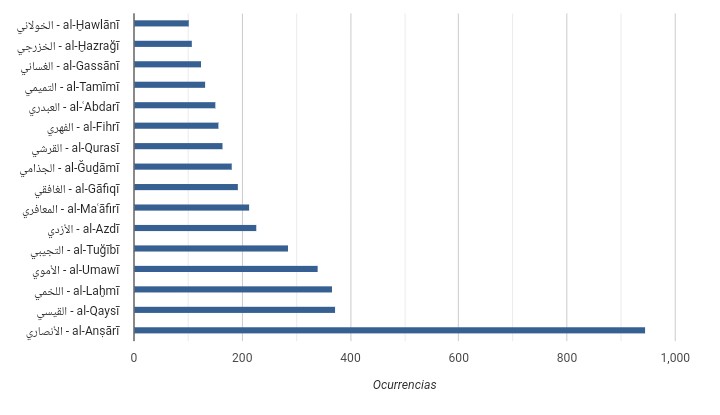 وقد تصدر قائمة العلماء العرب في الأندلس قبائل الأنصار بما يعادل 950 عالم، ثم القيسيون بما يعادل 390 عالم، ثم اللخميون بما يعادل 350 عالم، وتليهم بنو تجيب بما يعادل 290 عالم، وبعدهم تأتي قبيلة الأزد بما يعادل 220 عالم، وبنو معافر بما يعادل 210 عالم، وبنو غافق بما يعادل 190 عالم وغيرهم كما هو مبين في المبيان أسفله.
