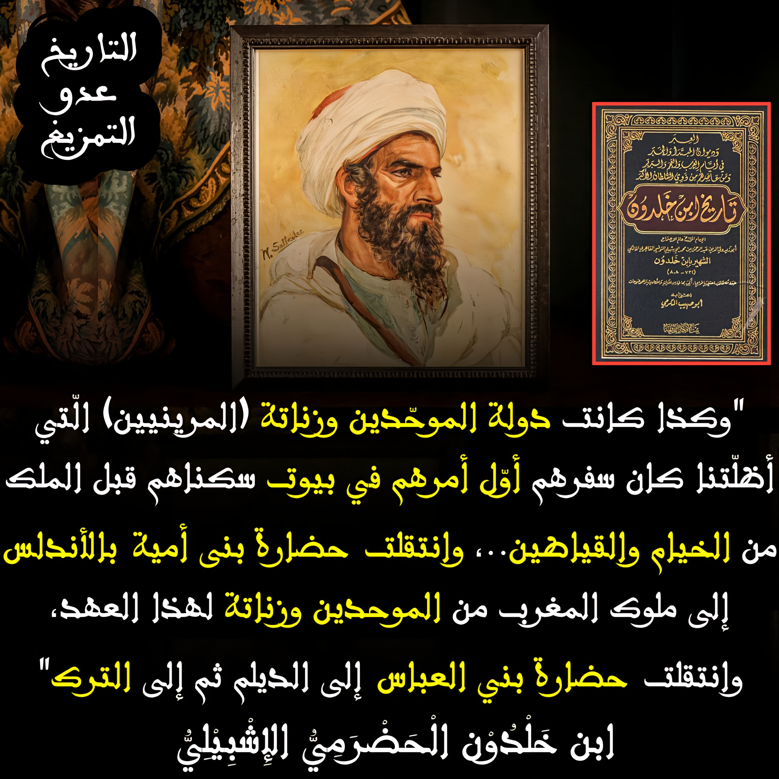 وكذالك قال إبن خلدون عن الموحدين والمرينيين أنهم كانو بدوا وإنما إنتقلت الحضارة لهم من العرب الأمويين بالأندلس فيقول ؛ “وكذا كانت دولة الموحّدين وزناتة الّتي أظلّتنا كان سفرهم أوّل أمرهم في بيوت سكناهم قبل الملك من الخيام والقياطين..، وانتقلت حضارة بنى أمية بالأندلس إلى ملوك المغرب من الموحدين وزناتة لهذا العهد، وانتقلت حضارة بني العباس إلى الديلم ثم إلى الترك “. (راجع هنا)